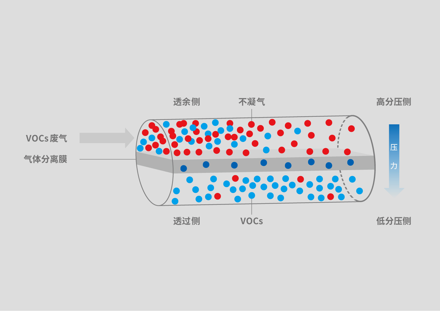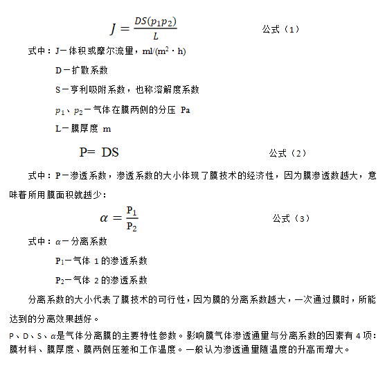 經(jīng)過以下3個步驟,由膜的高分壓側(cè)透過膜到達低分壓側(cè):①氣體吸附溶解在膜的高分壓側(cè);②在濃度差的作用下,溶解在高分壓側(cè)膜表面的氣體向低分壓側(cè)表面擴散;③到達低分壓側(cè)膜表面的氣體從膜體中解吸。