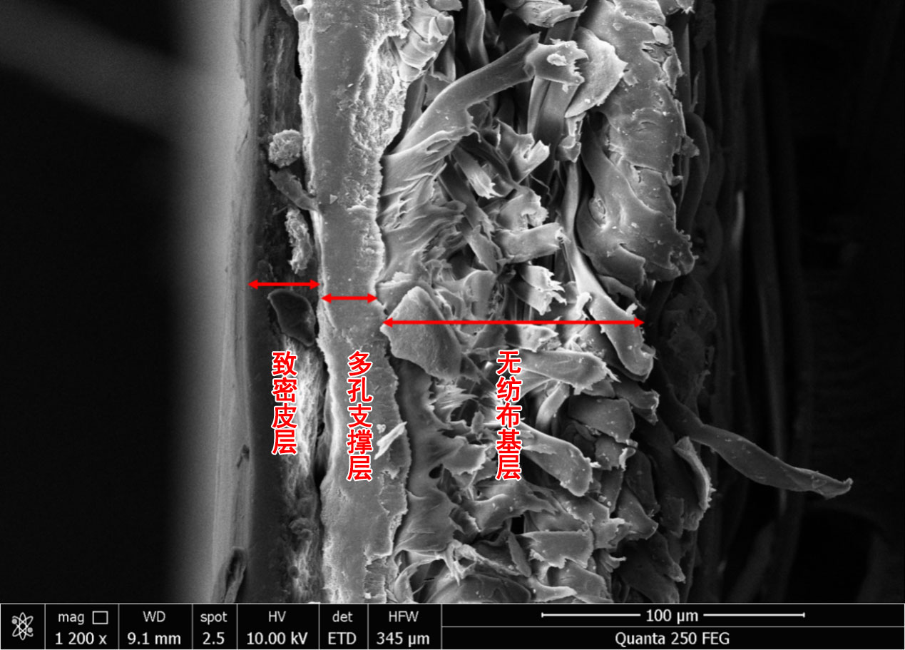 圖三 電鏡下氣體分離膜的三層結(jié)構(gòu)(照片由南京碳環(huán)生物質(zhì)能源有限公司提供)